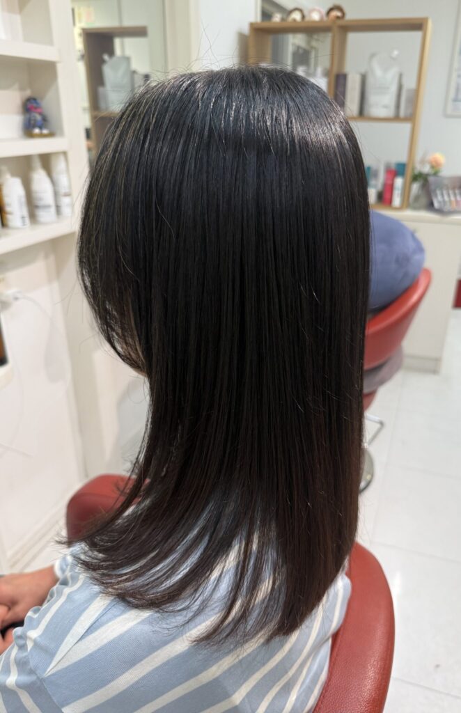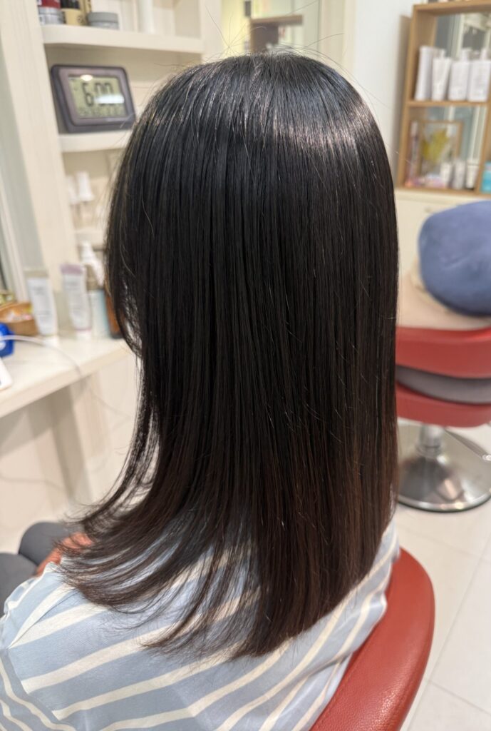 縮毛矯正のようにパーマ液の力でつやと真っ直ぐにするのではなくて、あくまでもトリートメントの力で『まとまりやすい髪に整える』メニューとなります。